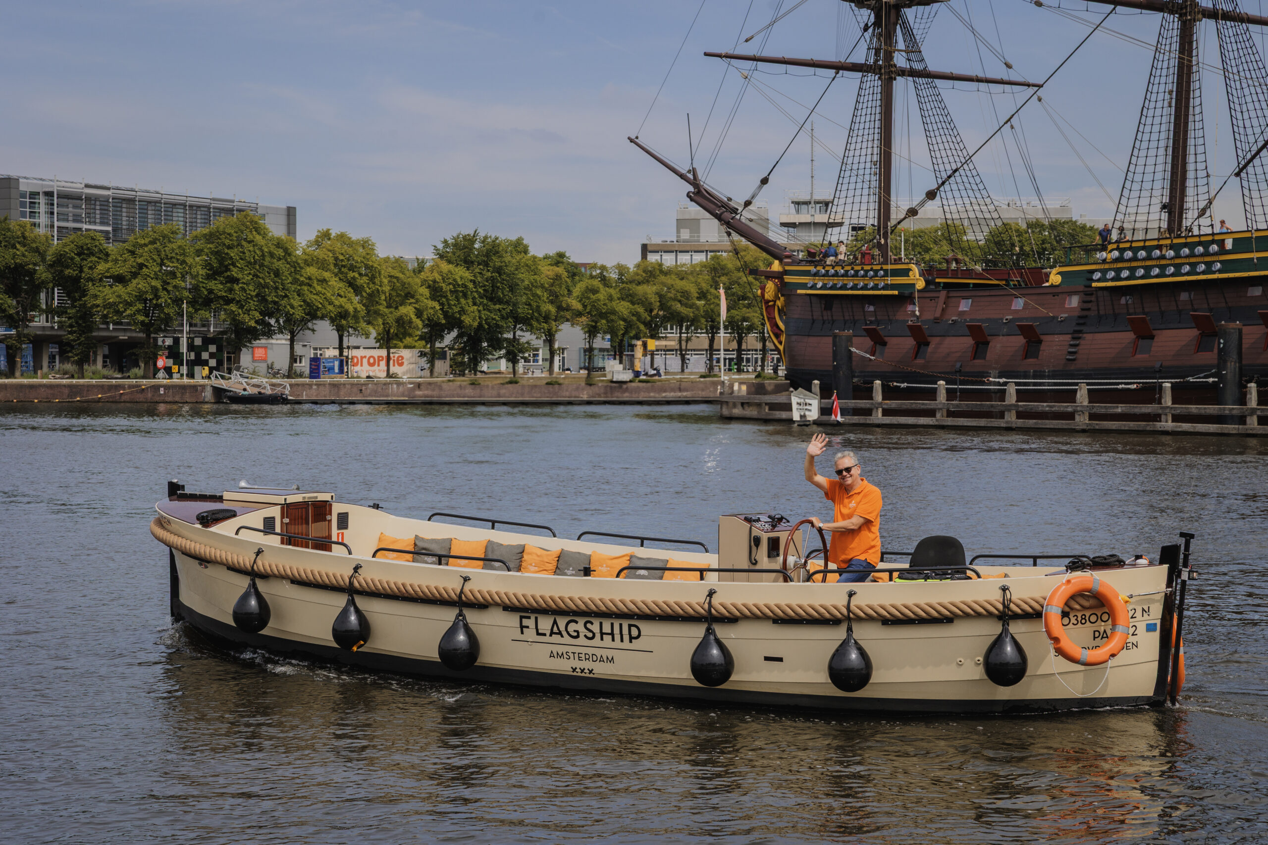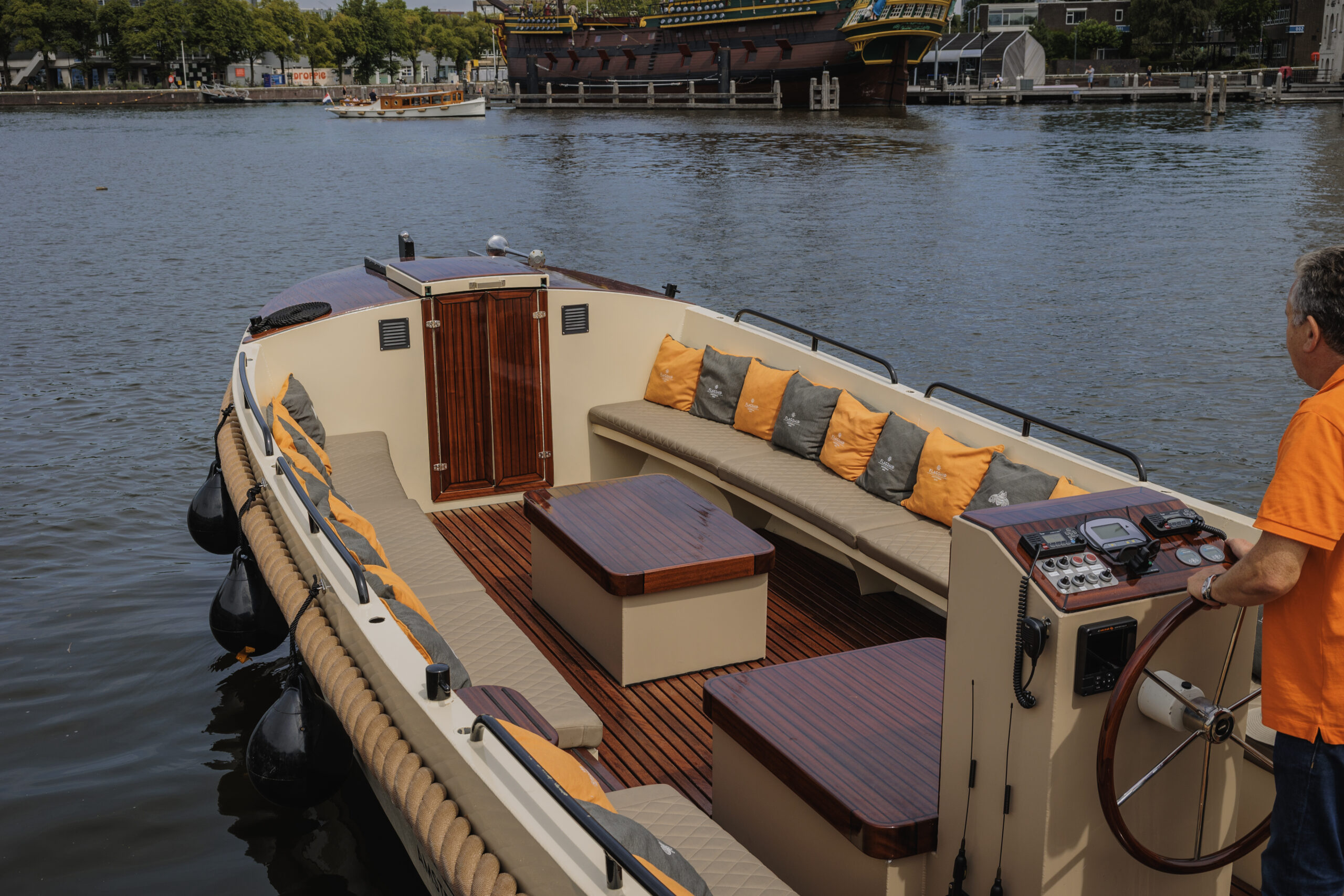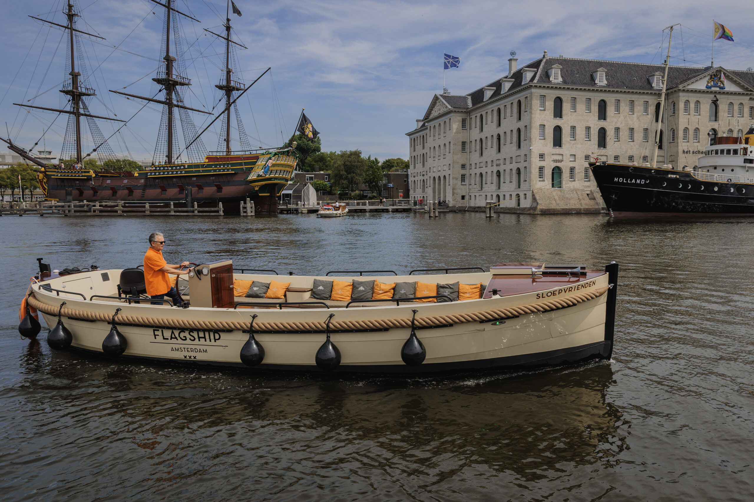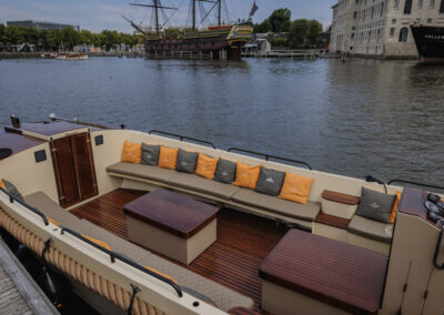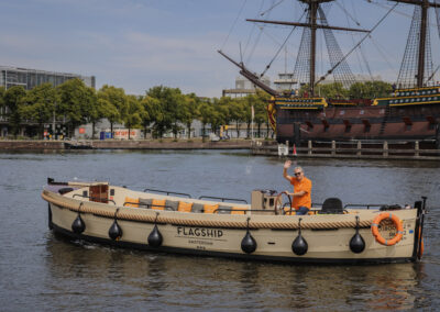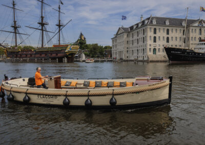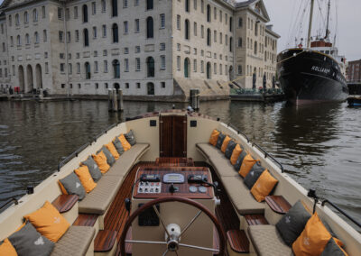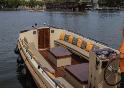 De sloep wordt verhuurd inclusief schipper, die je overal in Amsterdam kan ophalen. Catering is niet verplicht, je mag zonder toeslag eigen eten en drinken meenemen.