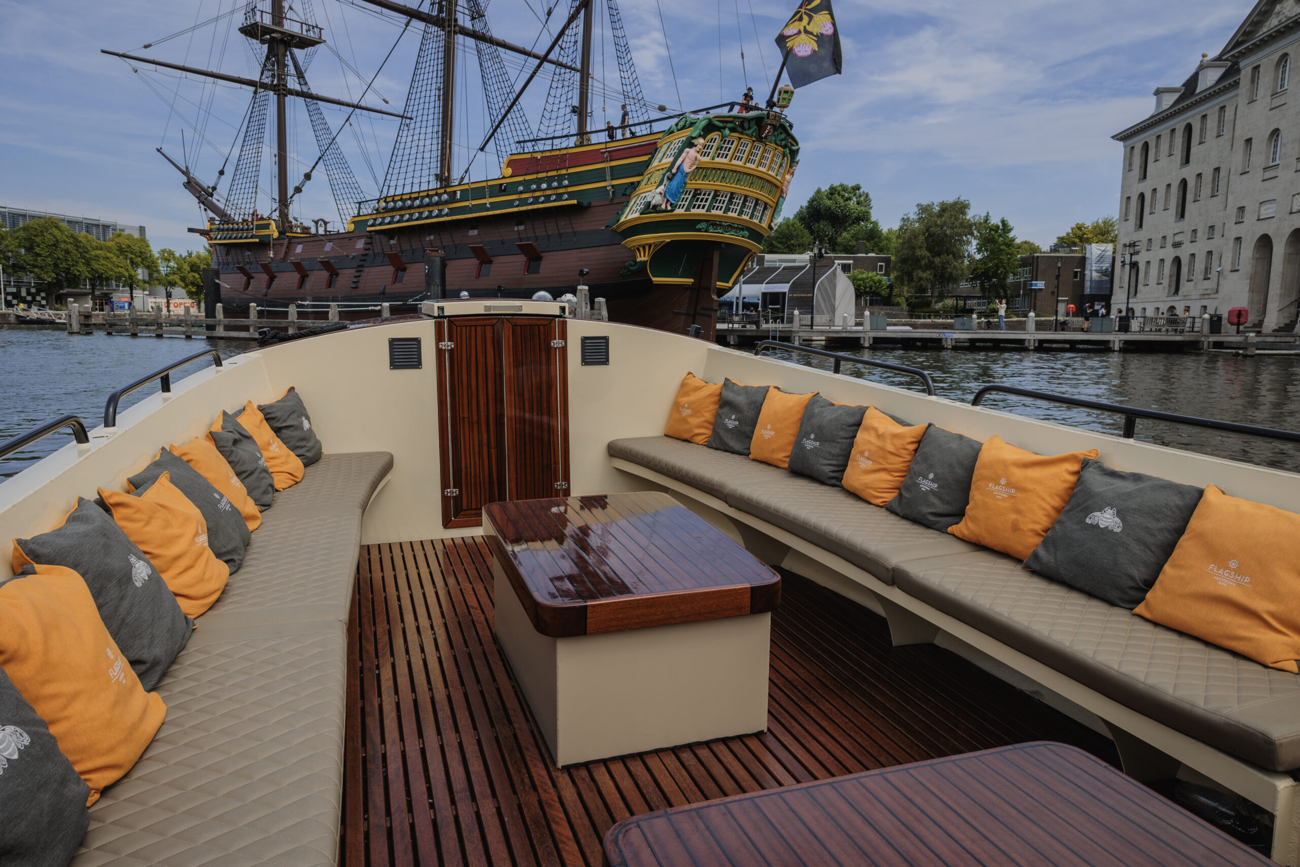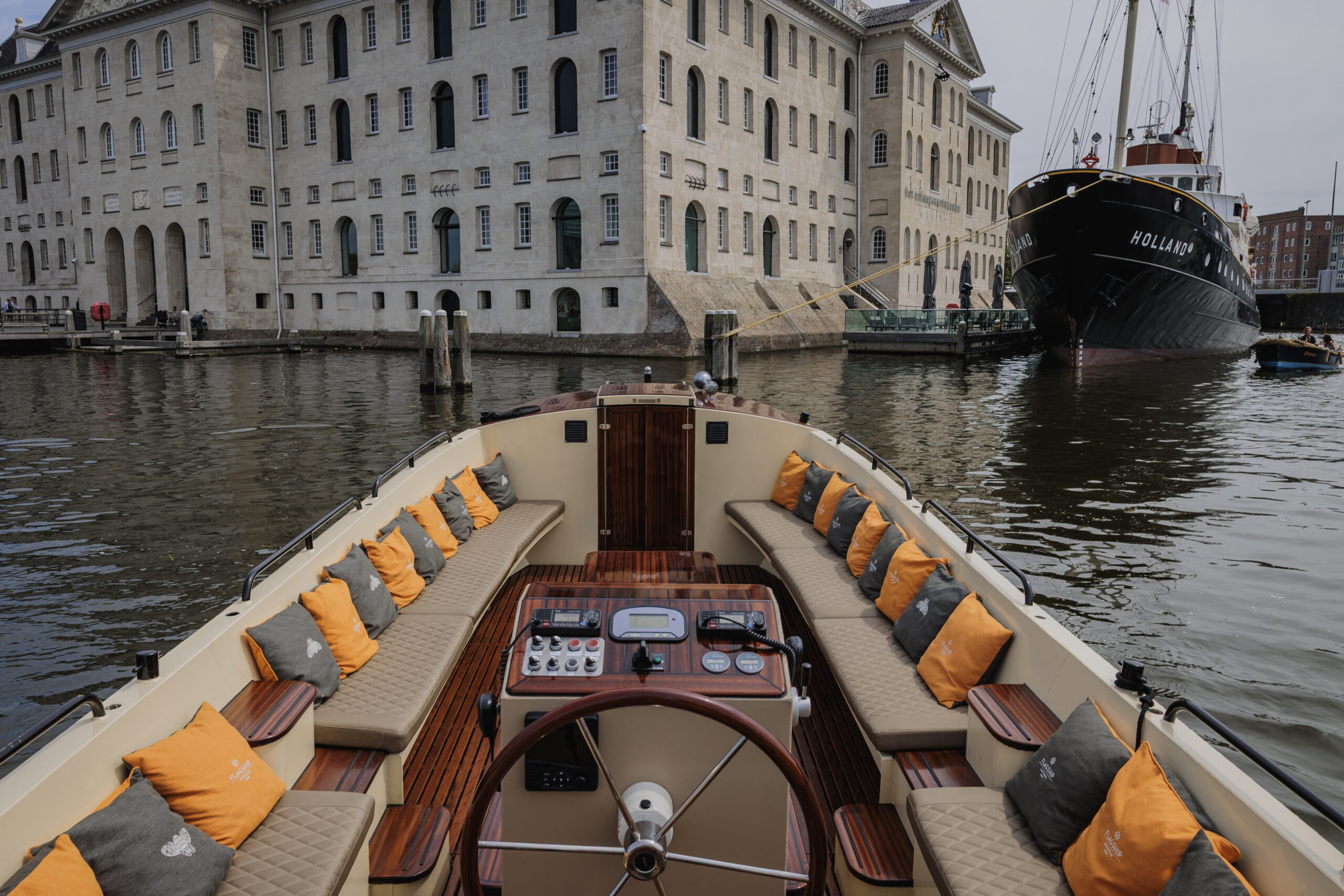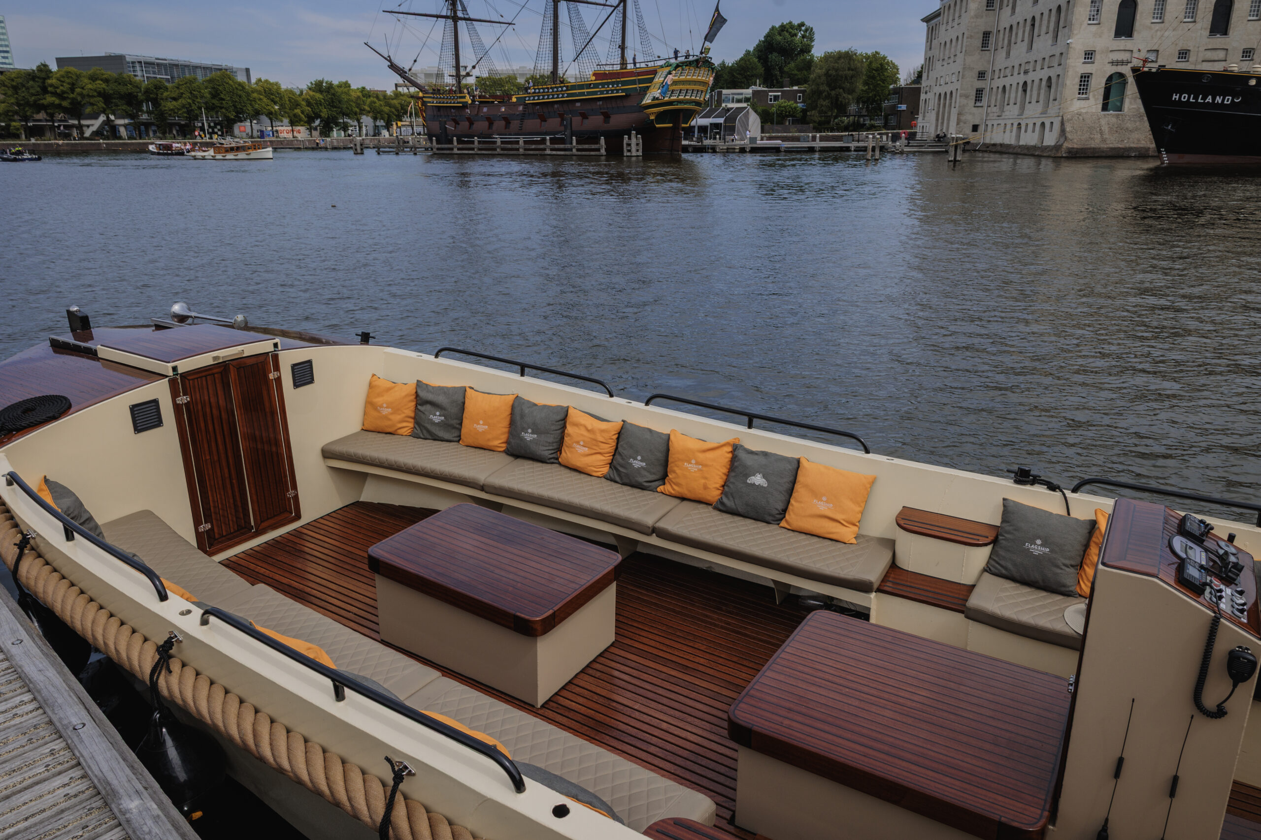 De sloep wordt verhuurd inclusief schipper, die je overal in Amsterdam kan ophalen. Catering is niet verplicht, je mag zonder toeslag eigen eten en drinken meenemen.